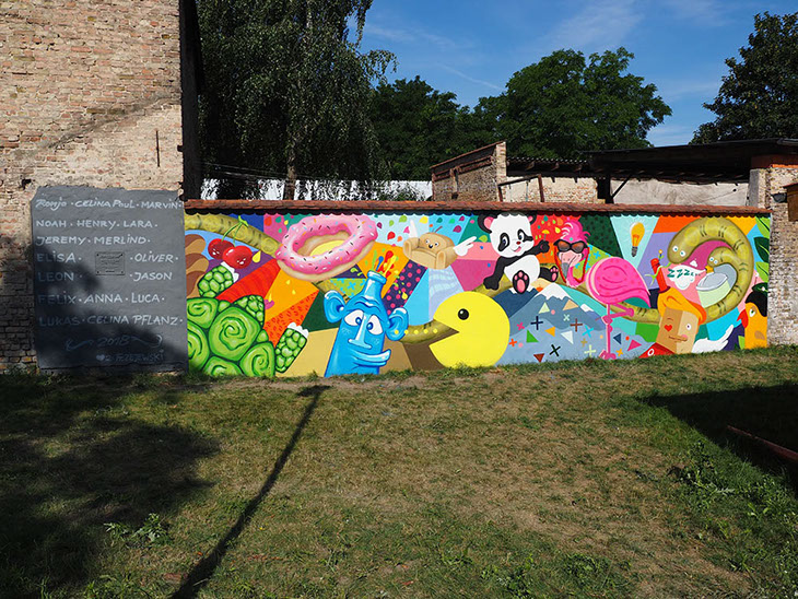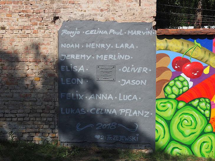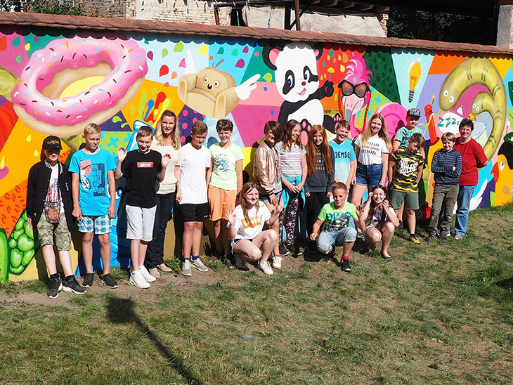 Zielgerade im regionalen Schulprojekt - Tag 3 Es ist vollbracht. Das Schulprojekt mit der Klasse 6 der Grundschule Jeserig wurde erfolgreich abgeschlossen. Die Kids und die Brandenburger Grafiker Enrico Gränzer und Guido Raddatz haben sich nochmal richtig in´s Zeug gelegt und es ist etwas tolles heraus gekommen. Gratulation! Das schicke Wandbild im Street-Art-Stil schmückt nun den Schulhof. Zur Erinnerung wurde auch ein Schild mit Wissenswertem an die Fassade gebracht. Bevor es allerdings soweit war, musste ein kleines Problem mit der Acrylscheibe beseitigt werden. Und da kam Herr Puppe, der Firma Mathias Dommnich, in´s Spiel. Solidarisch und unkompliziert half er, das Problem aus dem Weg zu räumen. Dankeschön dafür. Mc-Möbel ist stolz, mit ihrer finanziellen Unterstützung dieses Projekt begleiten zu dürfen und hofft, dass alle Schüler noch lange an diesem tollen Bild Freude haben.